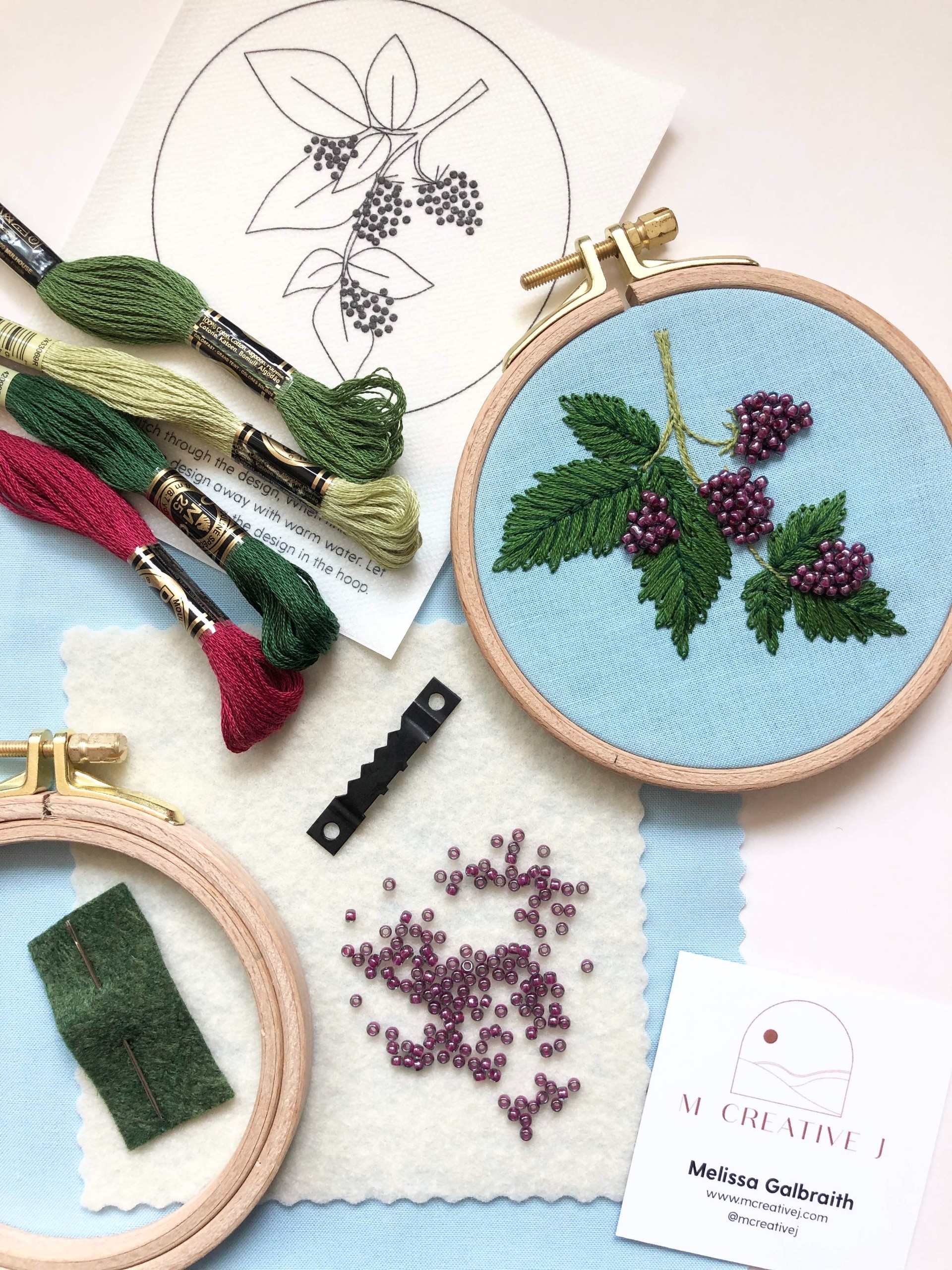 Beginner- Friendly embroidery kit includes: White cotton fabric, 4 – inch wooden embroidery hoop, full skeins of DMC embroidery floss , embroidery needle, felt, transfer design, sawtooth hanger hook, and directions on how to transfer, stitch the pattern, and recommended stitches.