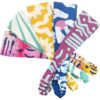 Wide center. Tapered sides. Covered elastic back. Elastic portion is 8″L. Headband is 10″Lx2″W at center. 100% cotton. Sold in assorted prints.