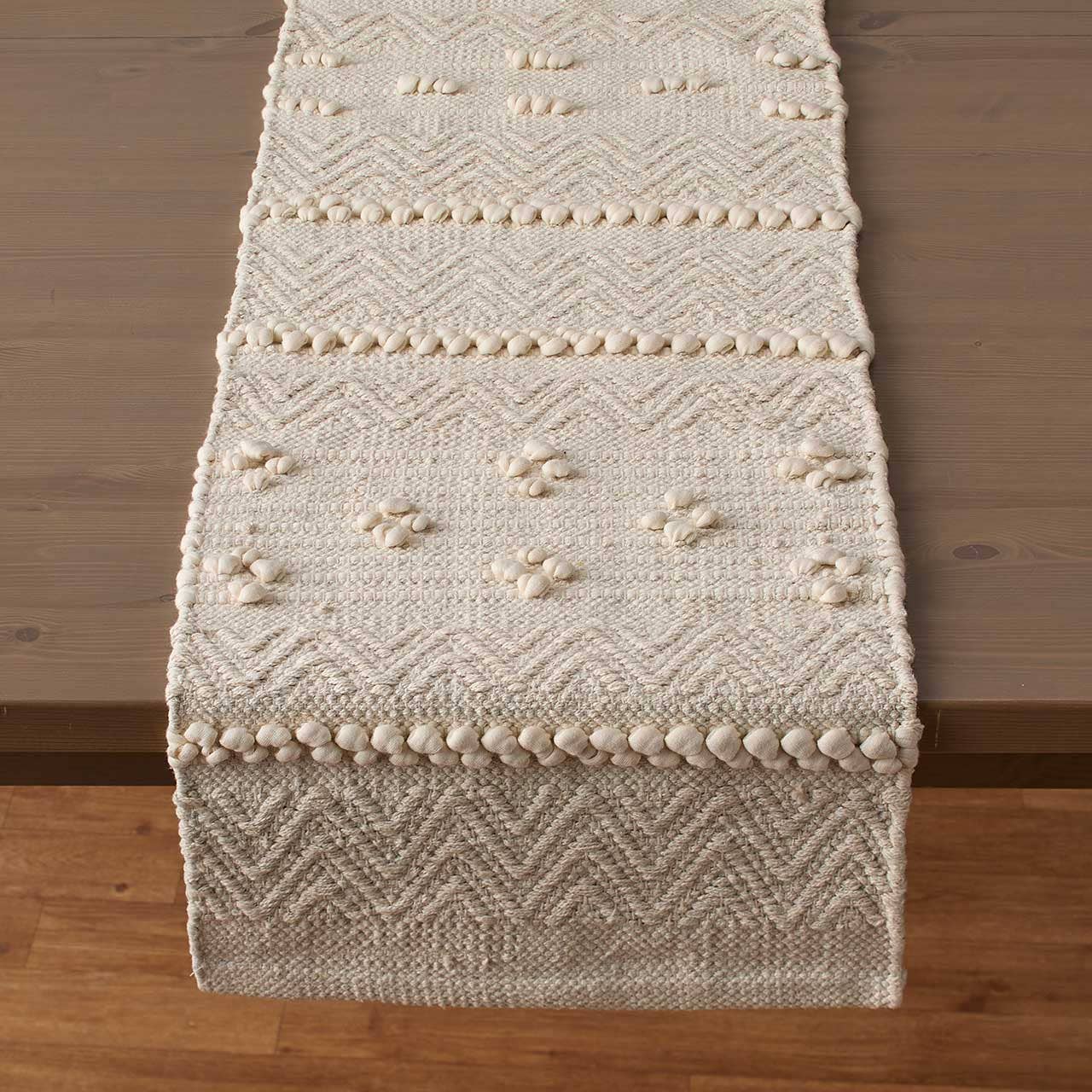 Bring natural texture and handcrafted charm to your table with this cream-colored cotton blend table runner. Perfect for boho-inspired or farmhouse-style décor, each runner is woven by hand using a soft blend of cotton slub, viscose, polyester, and rayon. Interwoven cotton jersey adds subtle texture and dimension, making this runner a unique and tactile accent for any tabletop. Dimensions: 72″l x 14″w