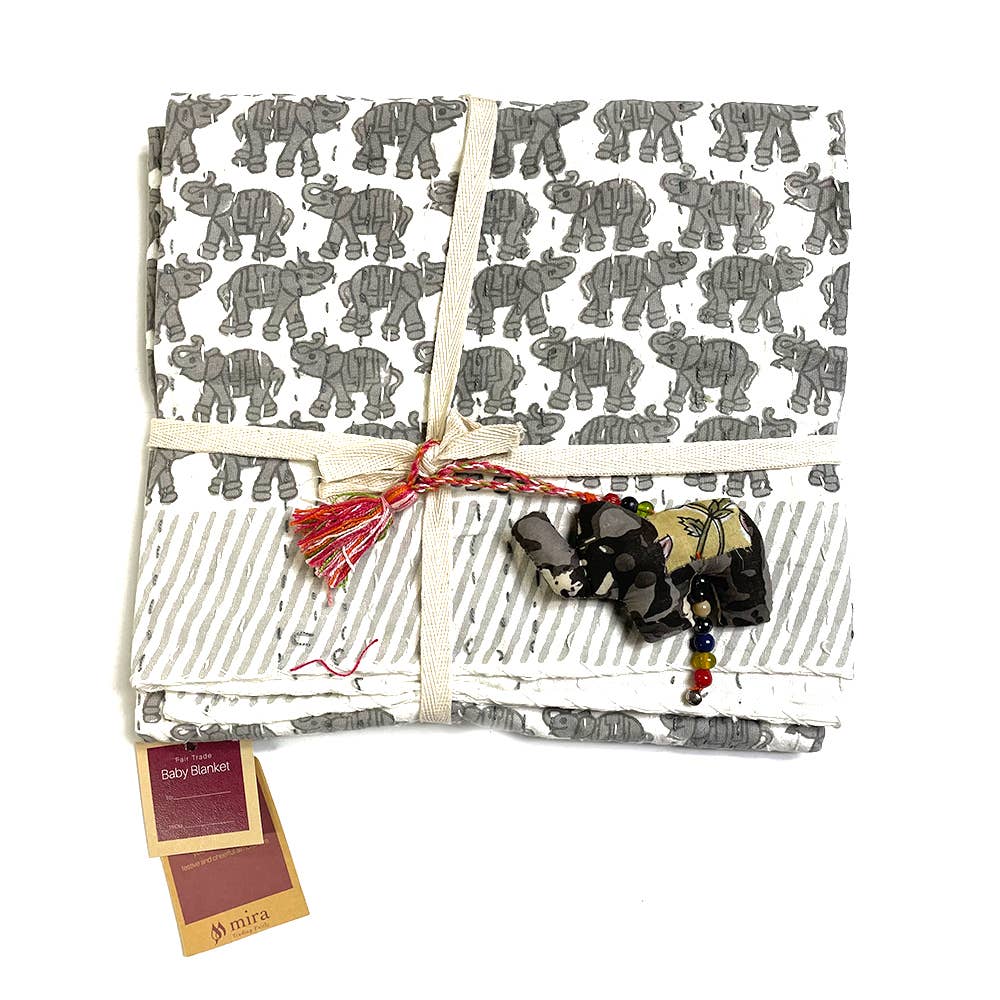 Keywords: elephant, baby, quilted, jungle, block print, gray, cotton, India, boho, fair trade, hand made, spring summer, fall, winter, gift, Mother’s Day, Father’s Day
