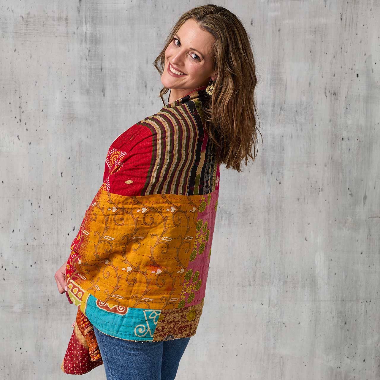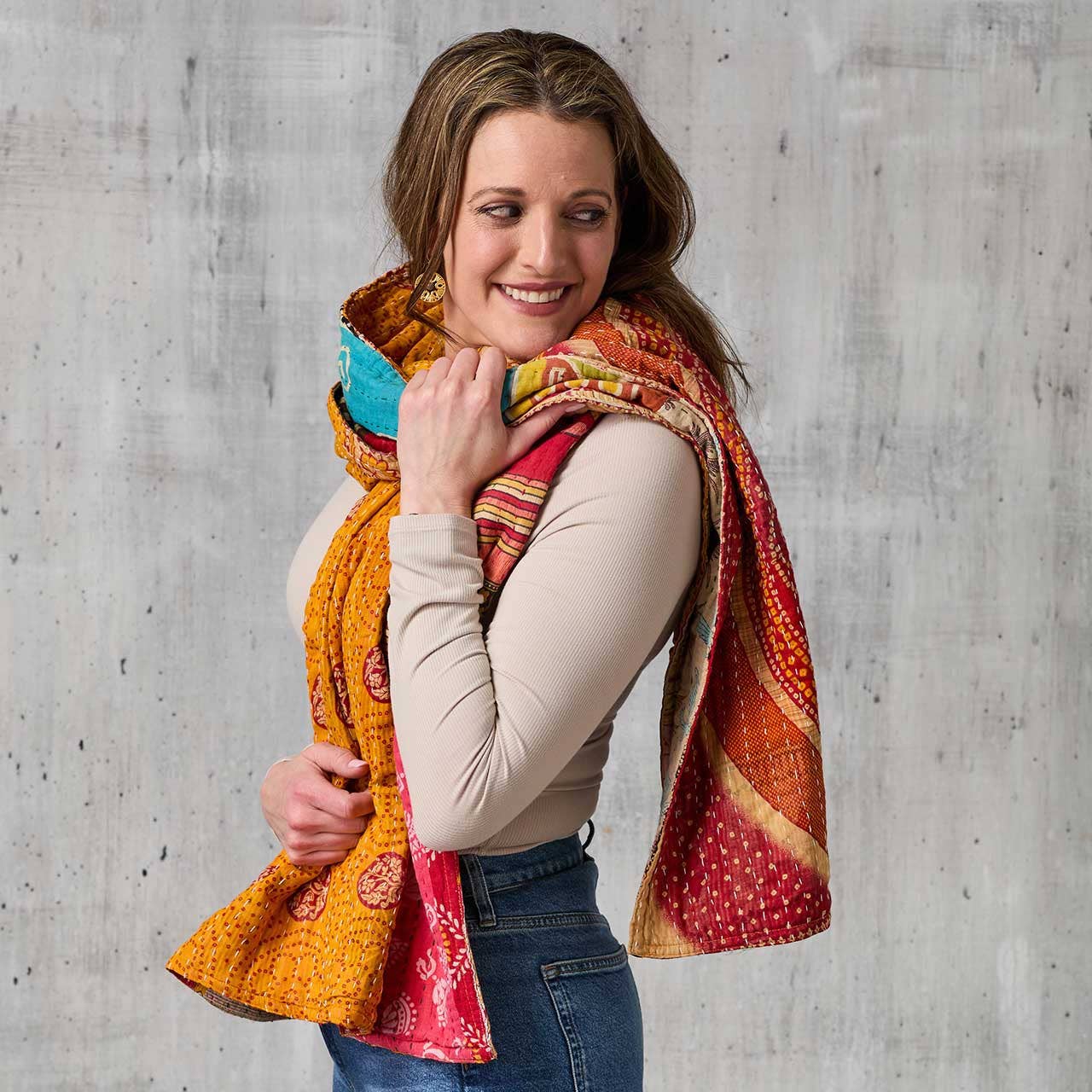 Express your individuality with this colorful, one-of-a-kind scarf made from sustainable, upcycled 100% cotton saris. Hand-stitched with traditional kantha embroidery, each piece features a vibrant mix of colors and patterns, creating a versatile accessory that elevates any outfit.
