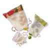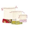 Ditch the plastic for these sustainable and beautifully-crafted produce bags! Each unique produce bag has a natural colored cotton mesh with recycled sari accent and twisted sari drawstring closure. Color and pattern will vary – let us choose for you. Hand wash only. Dimensions: Sm: 11 1/2″l x 10 1/2″w; Med: 12″l x 10″w; Lg: 14″l x 12″w. Keywords: mesh produce bags, reusable produce bags, farmer’s market bags