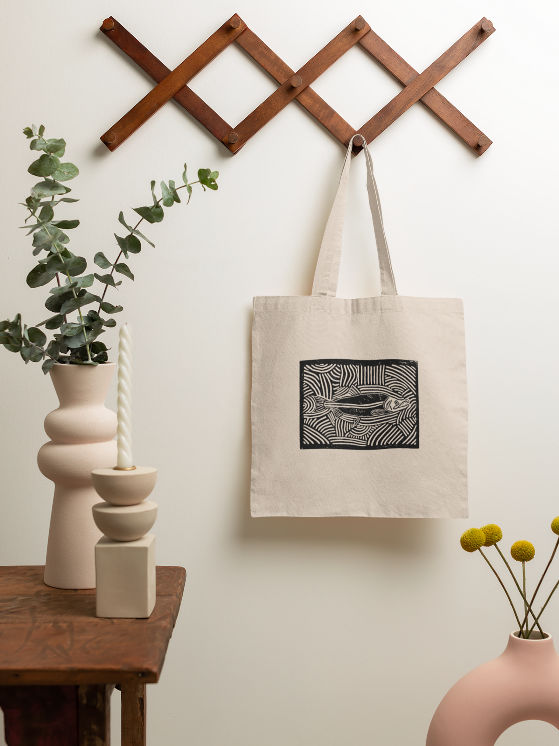 This salmon design started as a hand-carved linocut block print inspired by our Pacific sockeye salmon.